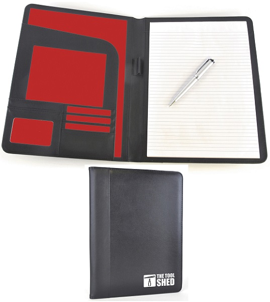 A4 PU Folder with edge trim. Includes document holder, business card holder, elasticated pen loop and 25 sheet, lined note pad. Available in black. Item size: 250x320x12mm