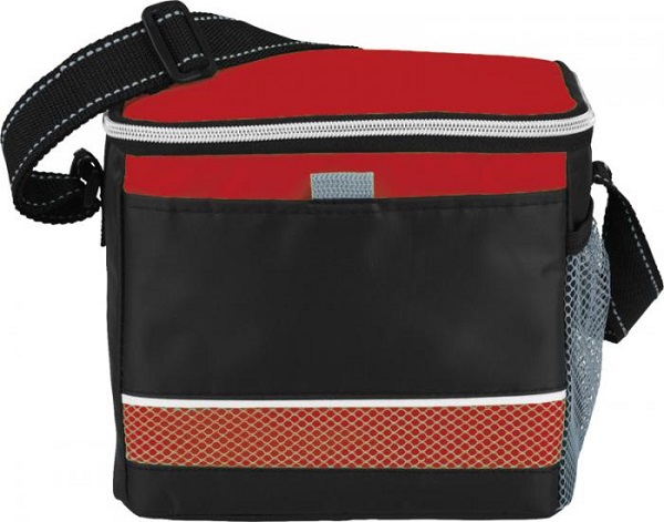 Levy sports cooler bag. Cooler with zippered main compartment. Open front pocket. Side mesh pocket. Adjustable shoulder strap. PEVA insulation. 70D Nylon.