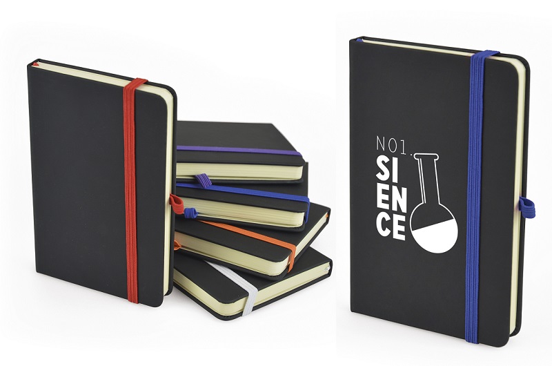 bookmark, back pocket for securing loose notes, coloured elastic pen