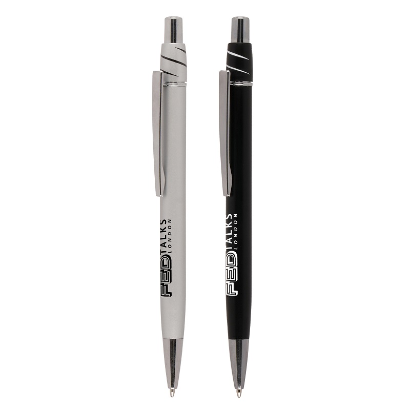 Aluminium push action ball pen featuring a 360 degree spinner on top to aid concentration and reduce anxiety. This pen is not only practical but also soothing for moments of stress.