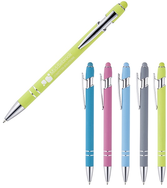 An aluminium pen with a \'soft-feel\' finish - now available in a range of vibrant tropical colours with matching stylus top.
