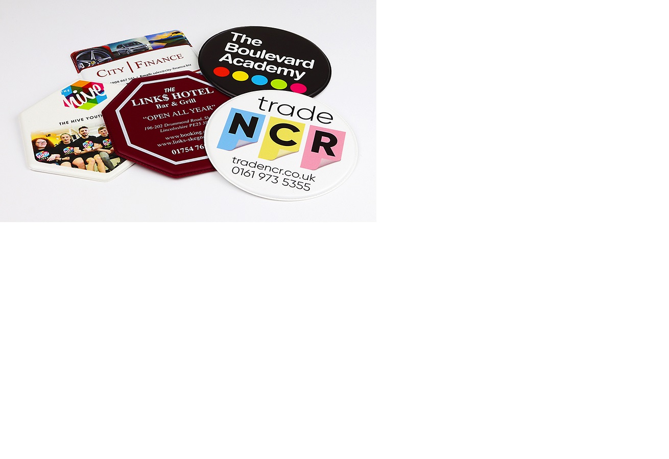 Available in various vinyl/PVC Coasters and available in 3 different shapes
