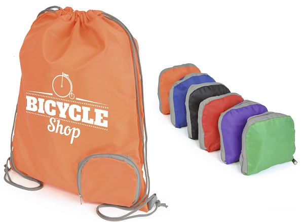 210D Polyester large drawstring bag which handily folds in the corner of the bag and sealed with a zip. Grey drawstring and grey trim to zipped pocket. Available in white. Item size: 430x320mm