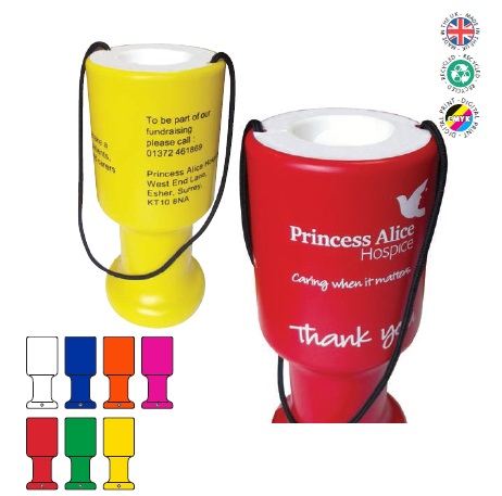 This popular charity collection box is available in a range of bright colours. Security chain can be supplied as an optional extra.