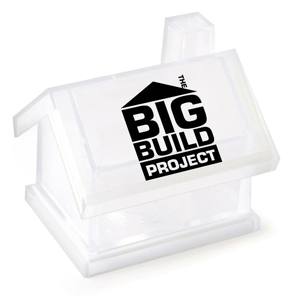 Plastic house shaped money box. Coins are inserted through the slot on the roof of the house. Once filled, empty using the cap base. A novel promotional gift for building projects. EN71 approved.